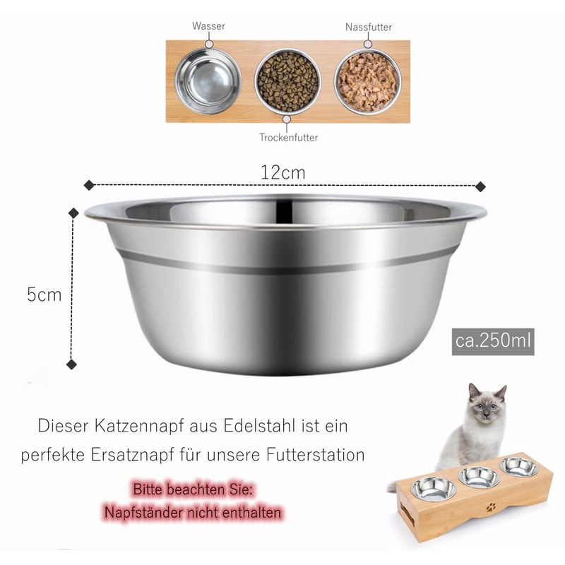 - 3 x bowls made of premium stainless steel. Dimensions: 12 cm diameter x 5 cm height. Capacity: approx. 250 ml