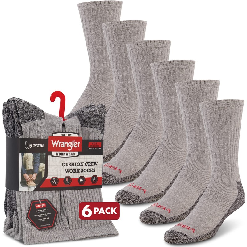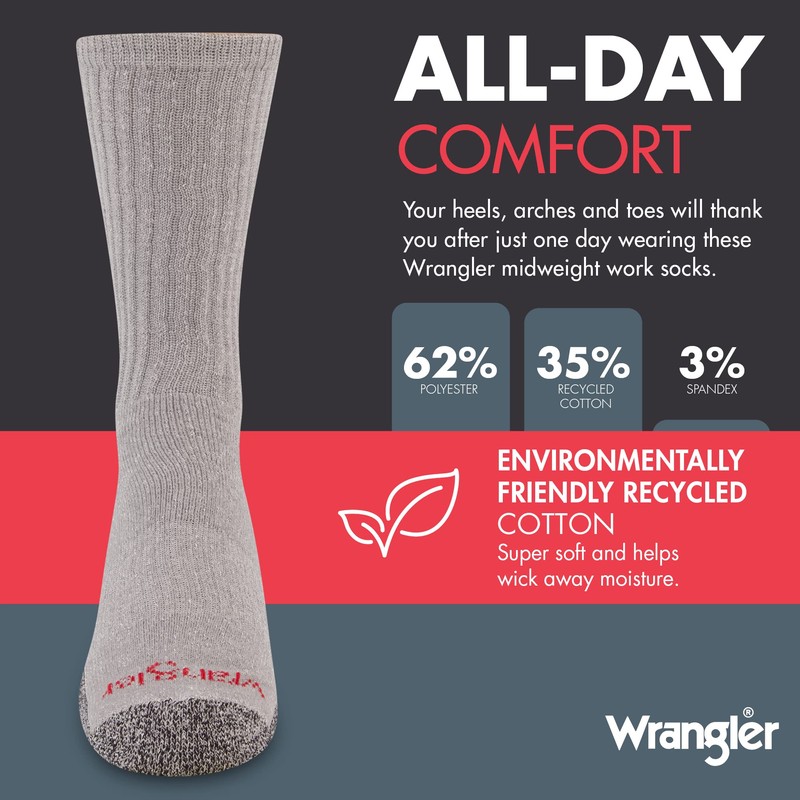 - ULTIMATE COMFORT - Wrangler socks for men are breathable, comfortable and cushioned for all day wear at work, school, home or on the field. Our unique stay-up comfort welt helps keep your crew socks secured to your ankle. That, along with their length makes them perfect for work boots or athletic shoes. Men's sizes 6-12.