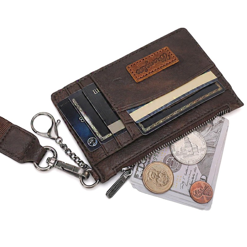 - The card holder with 6 card slots, 1 zippered cash pocket, 1 removable wrist strap, and 1 keychain ring, making it easy to attach your keys or hang it on your bag, freeing your hands and giving you peace of mind.