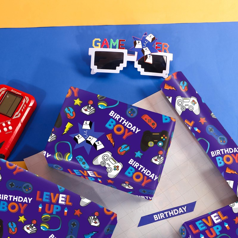 - Boys Birthday Design: Fun gaming design, games console, headphones and "Birthday Boy", "Level up" lettering print on blue wrapping paper, bright colors and interesting pattern will make your gift special and shining.