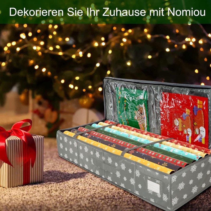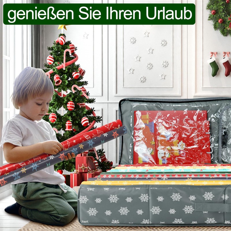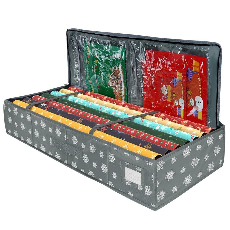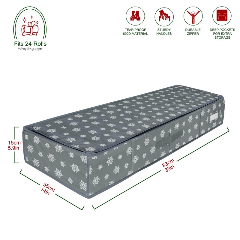 - Wrapping Paper Storage: Make sure your wrapping paper collection won't mess up! The premium wrapping paper storage organiser is the best way to store and organise all your wrapping paper rolls, Christmas decorations and accessories in one place. Grey snowflake design for Christmas cheer.