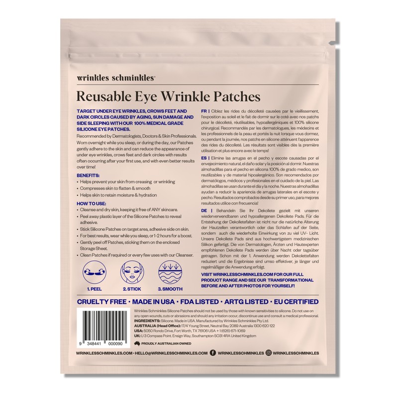 Whether your signs of aging around the eyes are caused by natural aging, hereditary, tiredness or your sleeping position, Wrinkles Schminkles' innovative Silicone Under Eye Pads work by comfortably hugging your skin and preventing the skin from being able to crease or wrinkle. At the same time, the Patches support the skin’s natural ability to hydrate the skin, retain the moisture, stimulate blood flow and helps boost collagen production – that vital protein we lose as our skin ages - helping to get rid of bags under the eyes and relieve crows feet wrinkles and lines.