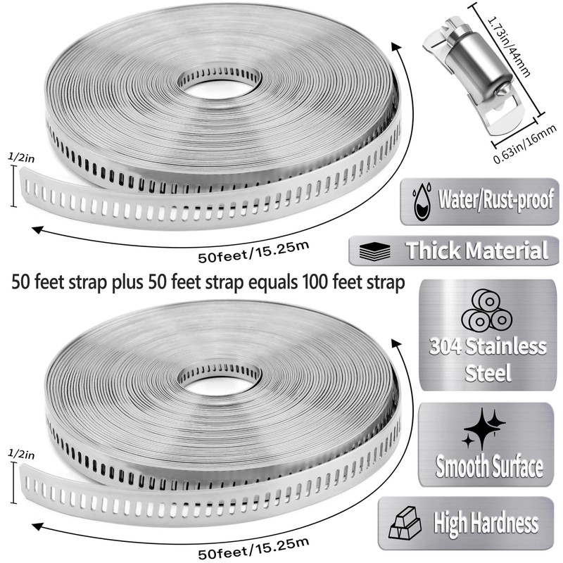 - Quantity:Each package provides 100 feet strap and 50 Pieces hose clamp fasteners.