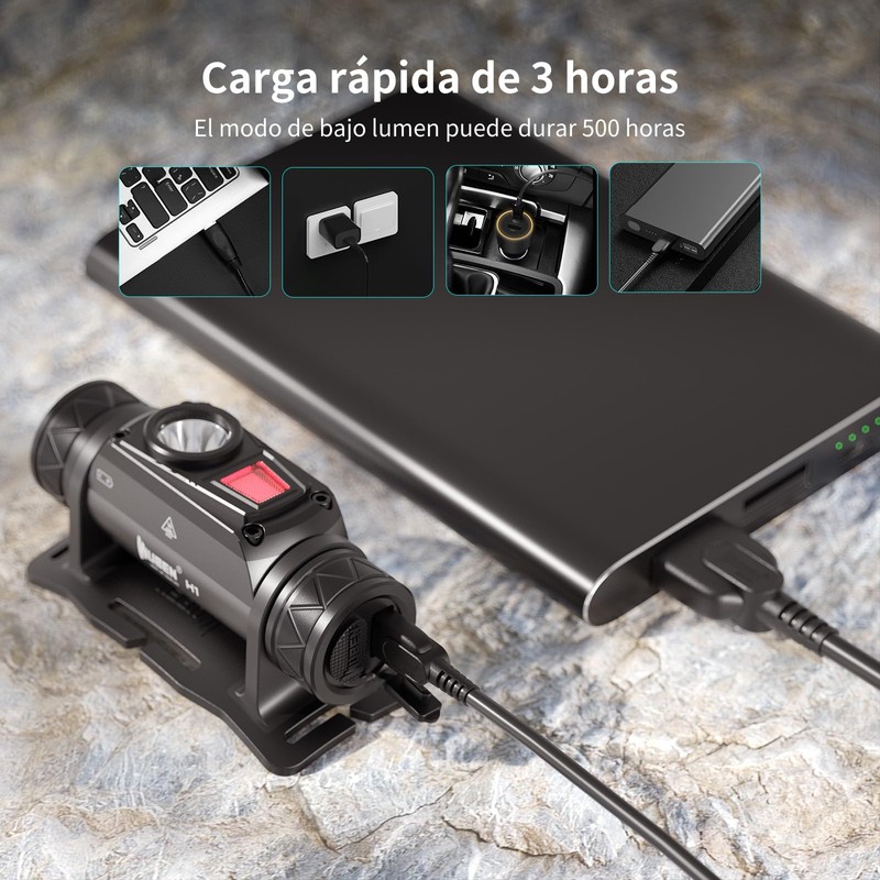 Tiene 10 modos de potencia de luz, 6 intensidades diferentes de luz blanca bien escalonadas y parpadeante SOS;modo de iluminación auxiliar: luz blanca, luz roja y luz estroboscópica roja, luz de baliza.También es regulable en la inclinación hasta 180º.