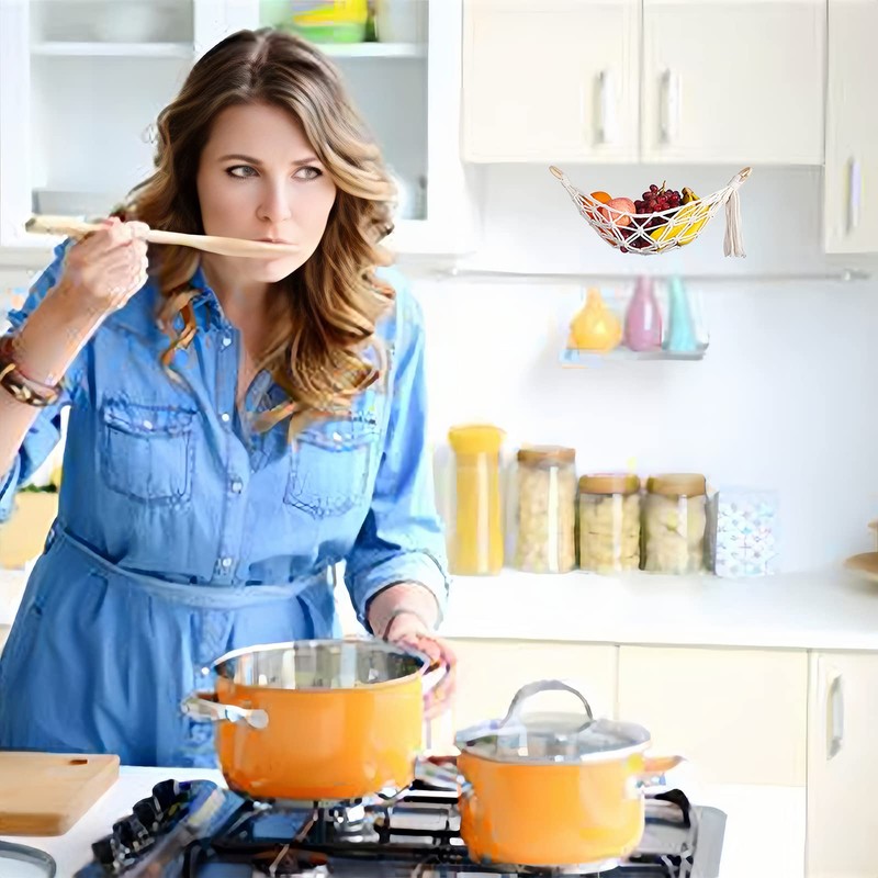 - Die Hängematte lässt sich leicht an einem Schrank aufhängen, nimmt keinen Platz auf der Arbeitsplatte weg und bietet zusätzlichen Stauraum, um Ihre Küche sauber und ordentlich zu halten.