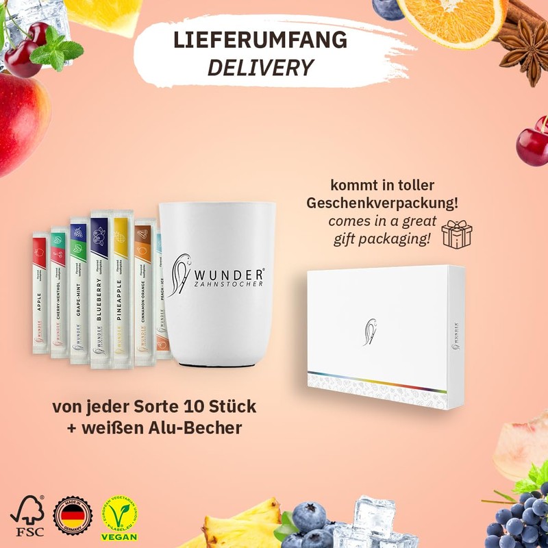 Wunder Zahnstocher With Flavour - 80 x Toothpicks Individually Packed + 1 x Toothpick Cup - Fresh Breath - Elegant Aluminium Cup for Your Toothpicks (Cup White + 80 Single Pack)