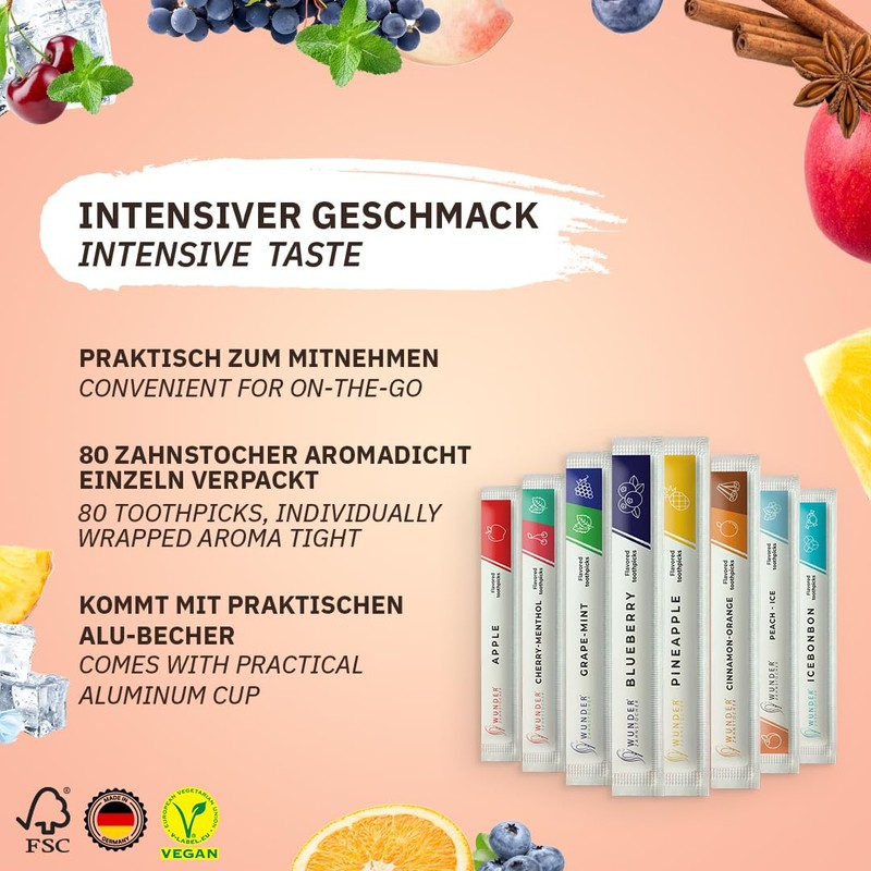 - Box contents: 80x toothpicks individually packed + 1x toothpick cup in white. Flavours: pineapple, ice candy, apple, blueberry, cherry menthol, cinnamon orange, grape mint, peach ice