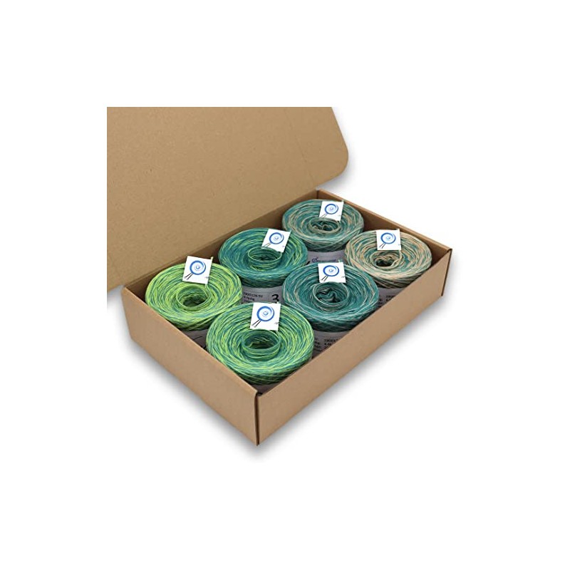- You will receive a box made of sturdy cardboard with 6 bobbles, 4-ply, each with 250 m running length. So you will receive a total of 1,500 m of yarn.