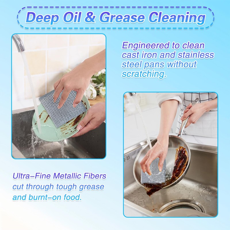 • Unbeatable Scouring Power (Wet or Dry): Tackle stuck-on grease, grime, and food residue effortlessly. These wire dishwashing rags for wet and dry cleaning work exceptionally well as dishcloths for washing dishes or powerful cleaning rags even on tough baked-on messes – simply use wet for lubrication or dry for abrasion