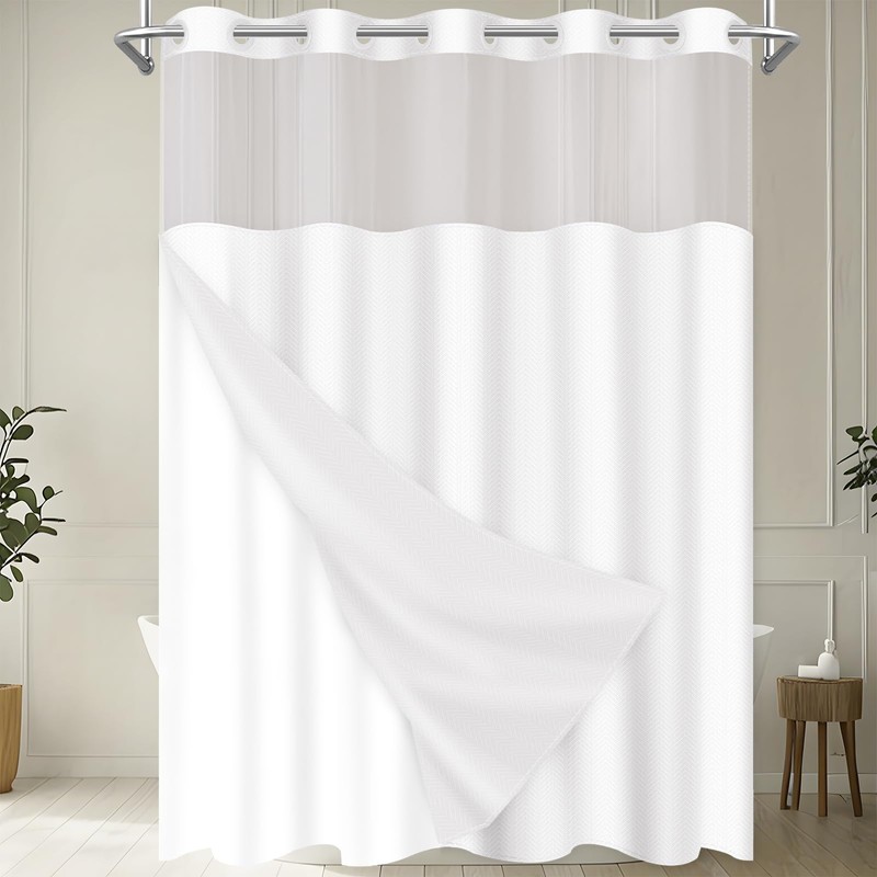 Shower Curtain No Hook for Bathroom: Features: Easy Installation: No hook shower curtain design allows for quick and easy installation without removing the shower rod Breathable and Privacy: Shower curtain and liner transparent window design, it can look out of the top part to keep an eye on things outside the shower, such as your child, pets, or the time etc Easy Cleaning: hotel shower curtain liner fabric washable snap-on waterproof fabric lining, easily removed for daily cleaning and deep maintenance. Standard Fit: 71"x86" standard size, matching most bathroom. Good Polyester: of durable and soft polyester material, it is wrinkle-resistant, waterproof, and supports low-temperature ironing