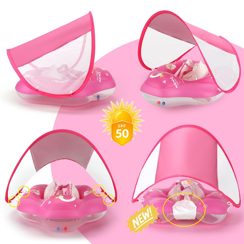 - Removable UPF 50+ sun protection canopy: the swimming ring from 1 year is equipped with a sun canopy that provides a UPF 50+ sun protection effect and protects the baby's sensitive skin from strong sunlight, perfect for summer outdoors. The mesh design on the sides of the baby swimming hoop provides clear vision, helps the baby interact with the parent while they swim, and ventilates to prevent overheating.