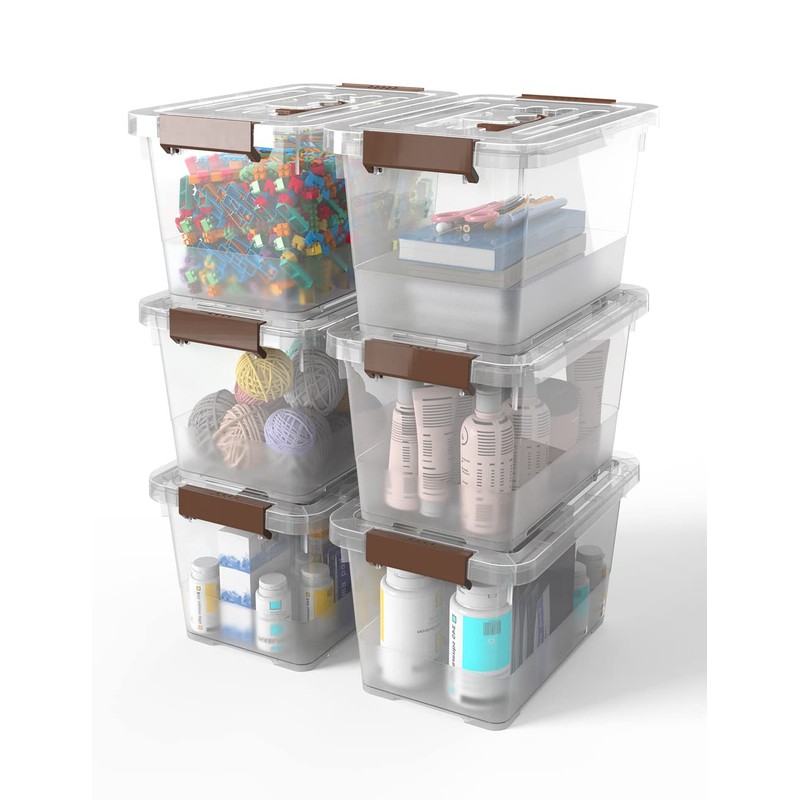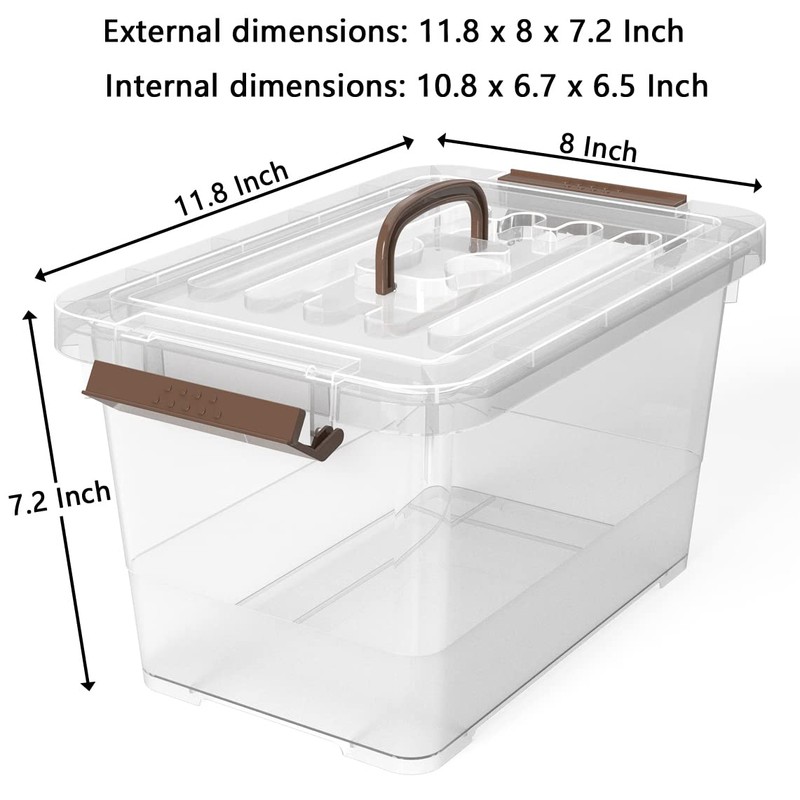 Multi-purpose Clear Storage Latch Box with Handle/Lids, 6-PackStorage Latch Bins MaterialMade of high quality and durable plastics, shock resistance is very good, box body is strong and durable enough to handle heavy loads, which can be holded up for long-term use.Storage Bins with Lids SizeOutside size : 12"L x 8"W x 7"HVolume : 7 LitreLiquid volume : 7 QuartExtensive Everyday UseThis versatile plastic storage box/bin can be used everywhere you need, including dry goods storage, site tools, storage room groceries, children's toys, drinks, snacks, candy.May also store short-term storage products such as flour, pasta and other items that may spill or leak. They make spills easy to clean by keeping them in containers.CUSTOMER SATISFACTION GUARANTEEWe hope all our customers happy purchasing from us, if you not satisfied with the storage box;We are happy to help you solve this problem or replace the product for you again.