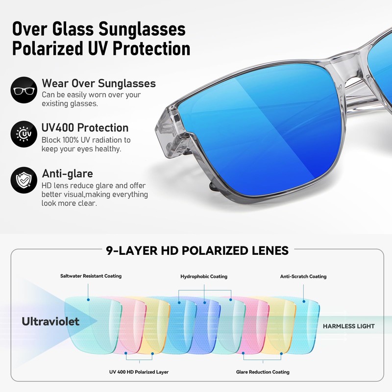 Enjoy clear and comfortable vision outdoors with our HD polarized sunglasses, providing 100% UV400 protection against harmful rays. Say goodbye to glare from roads, snow, and water surfaces, thanks to the polarized coating that enhances clarity without dazzling.