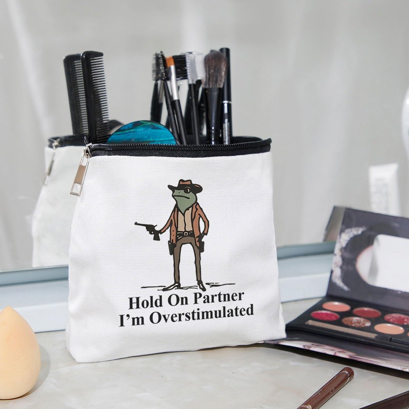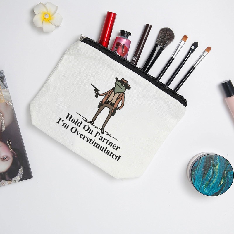 WZJHCL Western Frog Makeup Pouch Bag Frog Meme Cosmetic Kit Bag Cow Frog Storage Pouch Bag Hold On I'm Overstimulated (Partner)