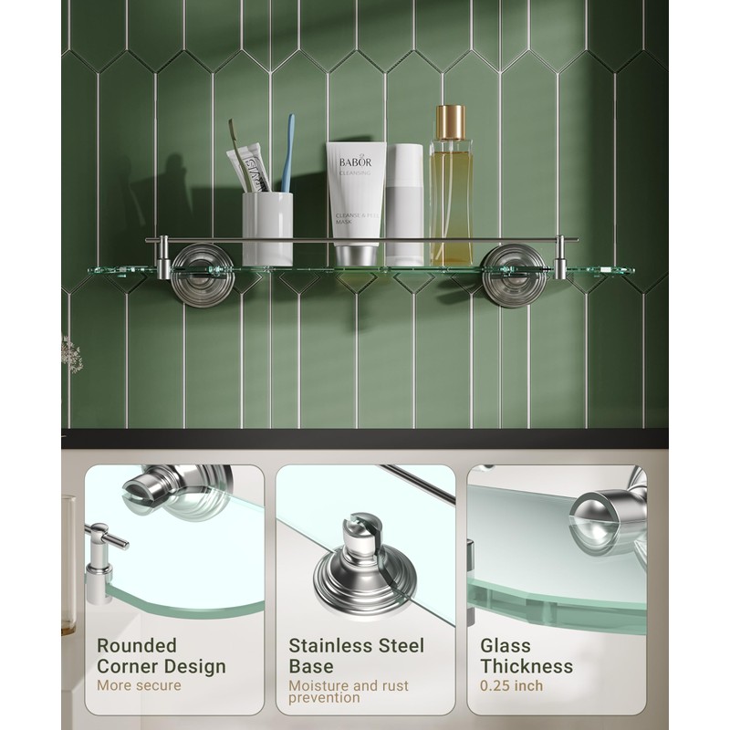- [Rounded Corner Design] The glass bathroom shelf’s rounded corner design of the product avoids the possibility of scratches and is safer