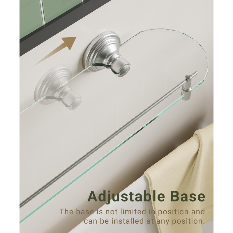 - [Adjustable Base] Our bathroom glass shelf’s movable base can be installed in any position you need