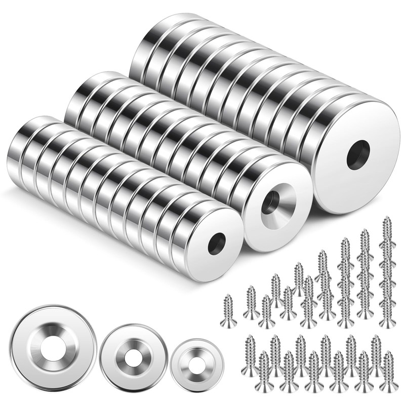 Wzone Set of 36 Mini Magnets Strong Set, 3 Sizes Neodymium Magnets with Hole with Screws Flat for Magnetic Plate, Kitchen, Fridge and Tool Room