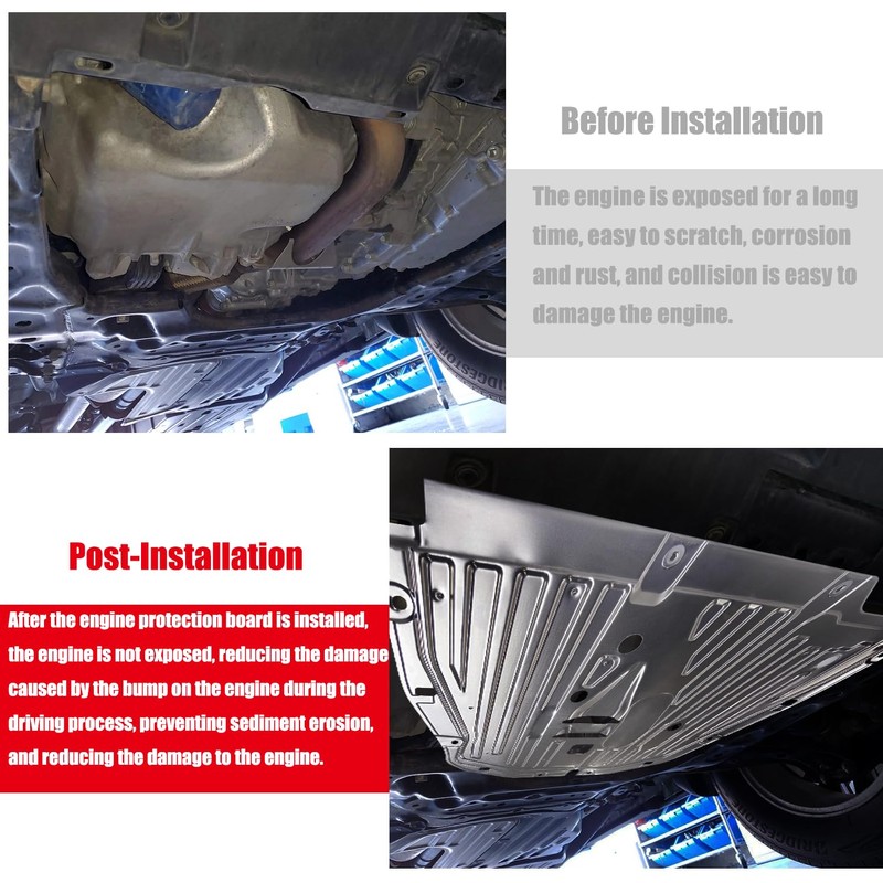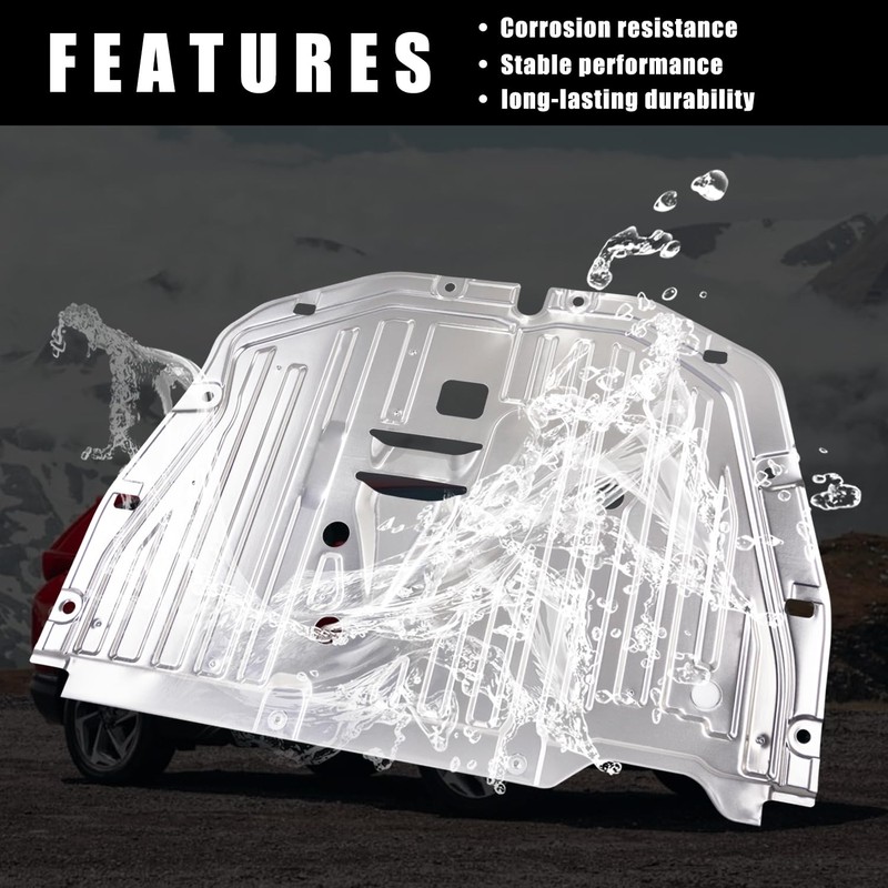 - Protects the engine from splashing and collisions with road debris, gravel, and other objects during driving