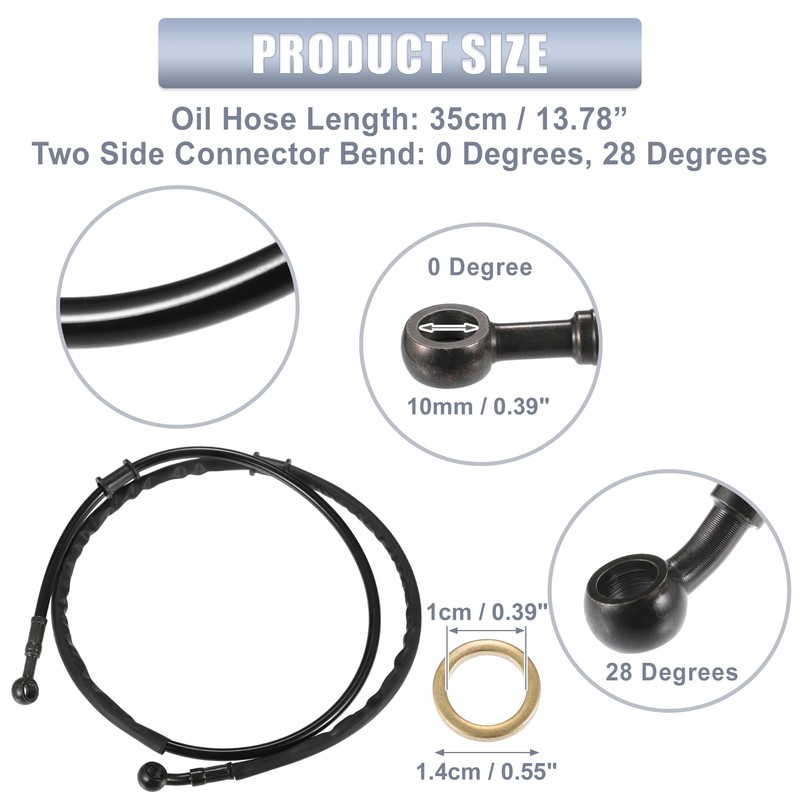 - Size: Two Side Connector Bend: 0 Degrees, 28 Degrees, Connector Inner Diameter: 10mm / 0.39", O Ring Diameter: 1.4x1cm/0.55"x0.39"(OD*ID), Oil Hose Length: 120cm/47.24"