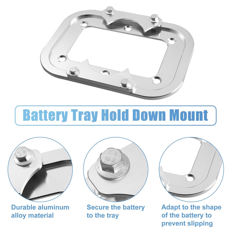 - Package Include: 6 x Nuts, 6 x 8mm Bolts, 4 x 10mm Bolts, 4 x Bolt Washers, 2 x Fixing Hold-Down Tabs, 1 x Battery Tray