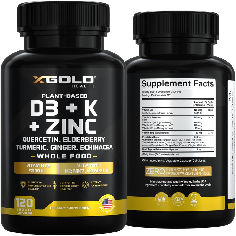- INVIGORATE YOUR IMMUNE SYSTEM: Revitalize your immune system with the Plant-Based Vitamin D (D3 from Lichen), Vitamin K (K2 MK7, K2 MK4, K1), Zinc, Quercetin, Elderberry, Turmeric, Ginger & Echinacea Daily Supplement from X Gold Health! Because happiness starts with good health, we've created this comprehensive one-a-day supplement to efficiently provide your body with what it needs to run at peak performance without a hitch!