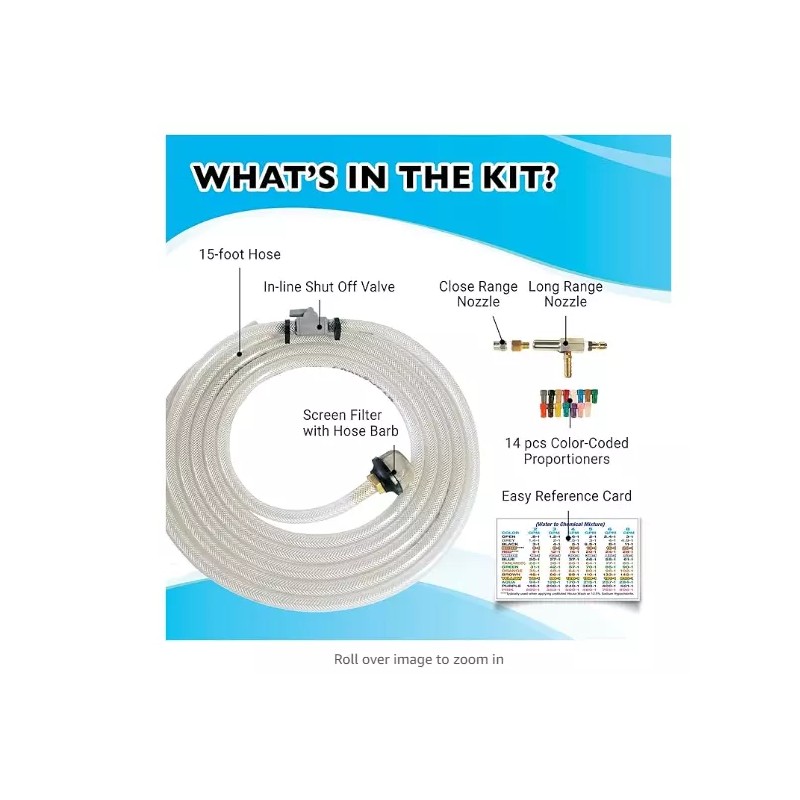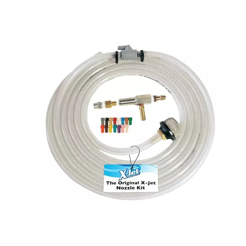 - COMPLETE KIT: This X-Jet kit includes both long range and close range nozzles, offering flexibility in application distances. Additionally, it comes with a 15-color coded proportioner set, a 15 ft hose assembly with an inline shutoff valve, and a tank screen filter, providing a comprehensive solution for your cleaning needs.