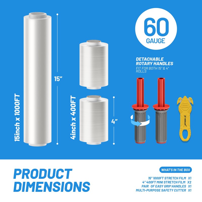 X-Wrap Stretch Wrap Stretch Film Roll with Handles, 1 Roll of 15 inch x 1000ft 60 Gauge Shrink Wrap, 2 Rolls of 4 inch 400ft Mini Wrap and Multi-Purpose Safety Knife Cutter