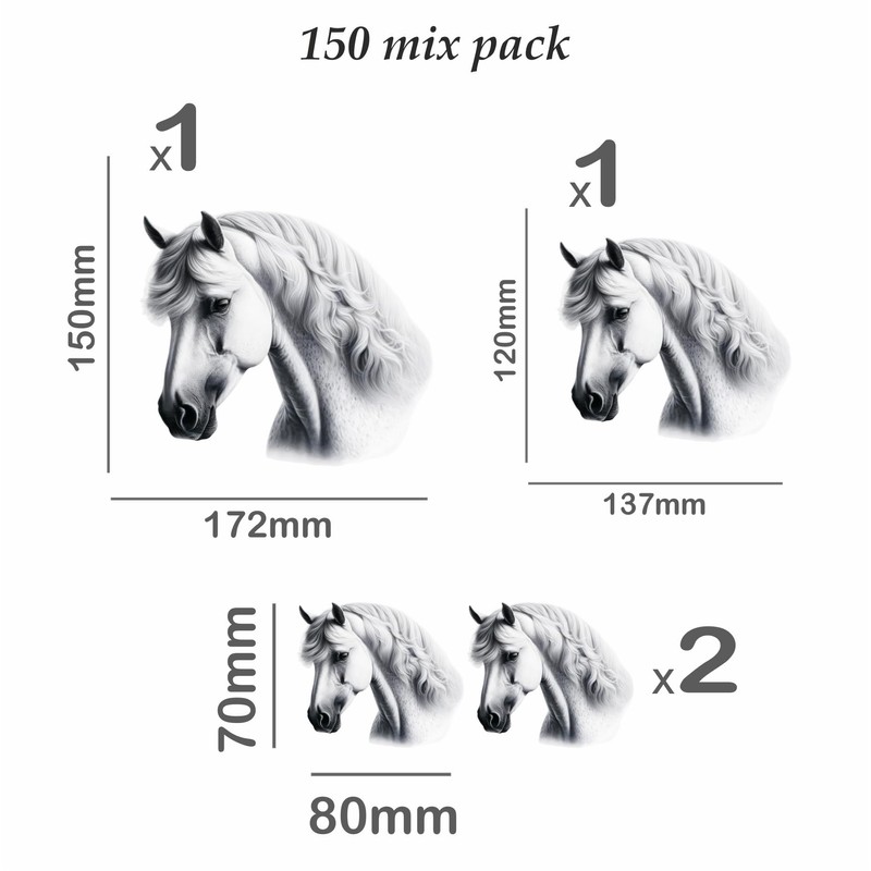 - White horse decals quantity:4 --- 1@150mm --- 1@120mm --- 2@70mm (2 left 2 right) to see exactly which size faces which way please refer to the sizing image.