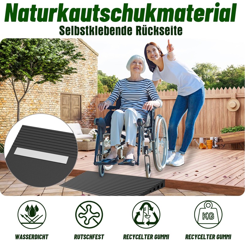 - Natural materials: the rubber threshold ramps are made of natural rubber. When used for the first time, a slight rubber smell may occur, but this is harmless and disappears after a short time. The ramps can be used both indoors and outdoors. It is recommended to air the ramp in a well-ventilated place before first use