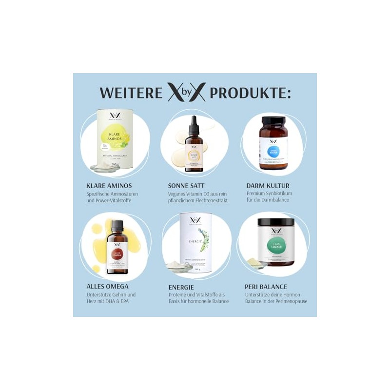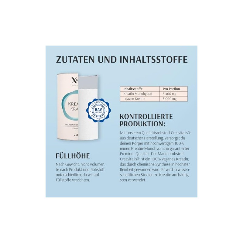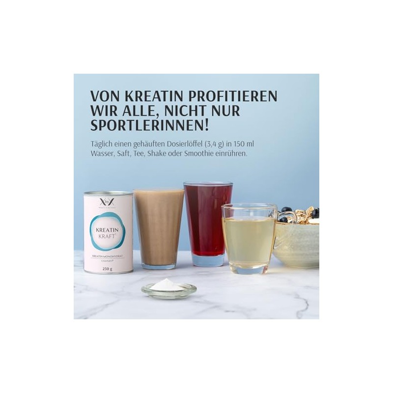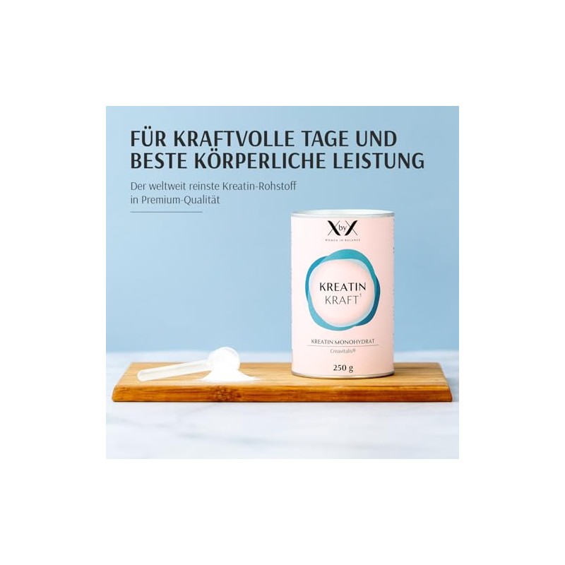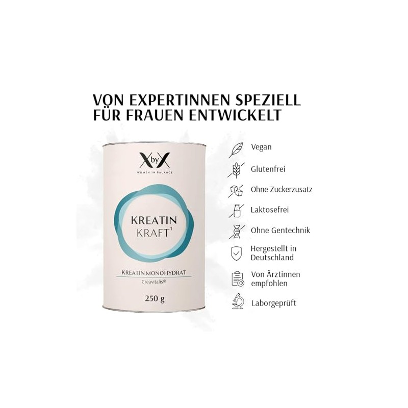 Produktbeschreibungen1Kreatin erh?ht bei einer t?glichen Aufnahme von 3 g die k?rperliche Leistung bei Schnellkrafttraining im Rahmen kurzzeitiger intensiver k?rperlicher Bet?tigung. Mit 100% reinem Creatin Monohydrat, das eine hohe Bioverfgbarkeit aufweist, steigert dieses geschmacksneutrale Pulver deine Schnellkraft bei intensiven Trainingsbelastungen und hilft, deine sportlichen Ziele schneller zu erreichen. Eine t?gliche Einnahme von 3g Creatin untersttzt den Muskelaufbau und erh?ht die Leistungsf?higkeit w?hrend intensiver, kurzzeitiger Trainingseinheiten.1 Dieses Produkt ist besonders fr Frauen entwickelt, die Wert auf ihre Gesundheit und Vitalit?t legen, und es passt ideal als Erg?nzung bei einer veganen oder vegetarischen Ern?hrungsweise. XbyX Kreatin Kraft ist frei von jeglichen Zus?tzen, 100% vegan und geschmacksneutral, sodass es problemlos in deinen Ern?hrungsplan integriert werden kann. Ob im Smoothie, Shake oder Wasser Kreatin Kraft l?sst sich hervorragend aufl?sen und flexibel dosieren. Profitiere von den wissenschaftlich erforschten Vorteilen von Creatin und bring deine Fitness auf das n?chste Level. XbyX Kreatin Kraft fr kraftvolle Tage und die beste Untersttzung deines K?rpers!Inhaltsstoffe / Zutaten100% Kreatin MonohydratGebrauchsanweisungL?sen Sie das Kreatin-Monohydrat-Pulver in Wasser oder Saft auf und nehmen Sie es ein.