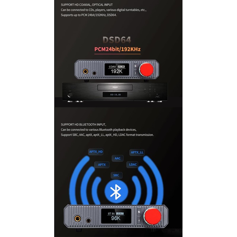 • 【SUPPORTS MANY MUSIC FORMATS】Support full MQA format, maximum support 8 times expansion, that is 32bit / 384khz.Support DSD format, maximum support DSD256.Support PCM formats, maximum support 32bit / 384khz.Support DXD formats, maximum support 32bit /384khz.