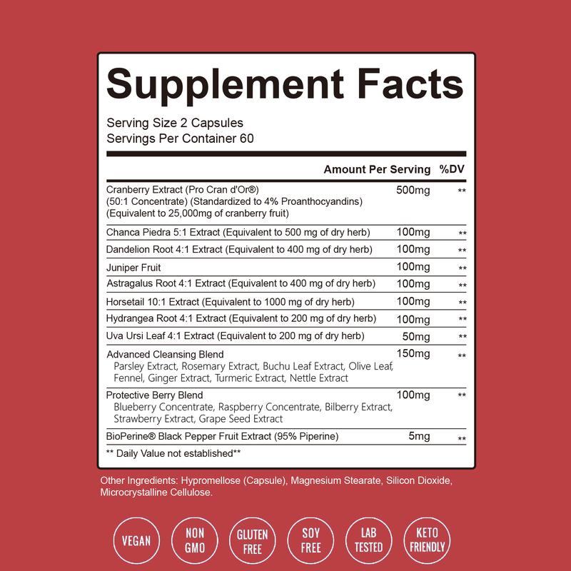 Cranberry Extract, BioPerine - Kidney & Urinary Tract Support Contains no artificial colors, artificial flavors, preservatives, yeast, corn, milk or milk derivatives, lactose, salt, sodium, soy, sugar, gluten, starch or wheat.