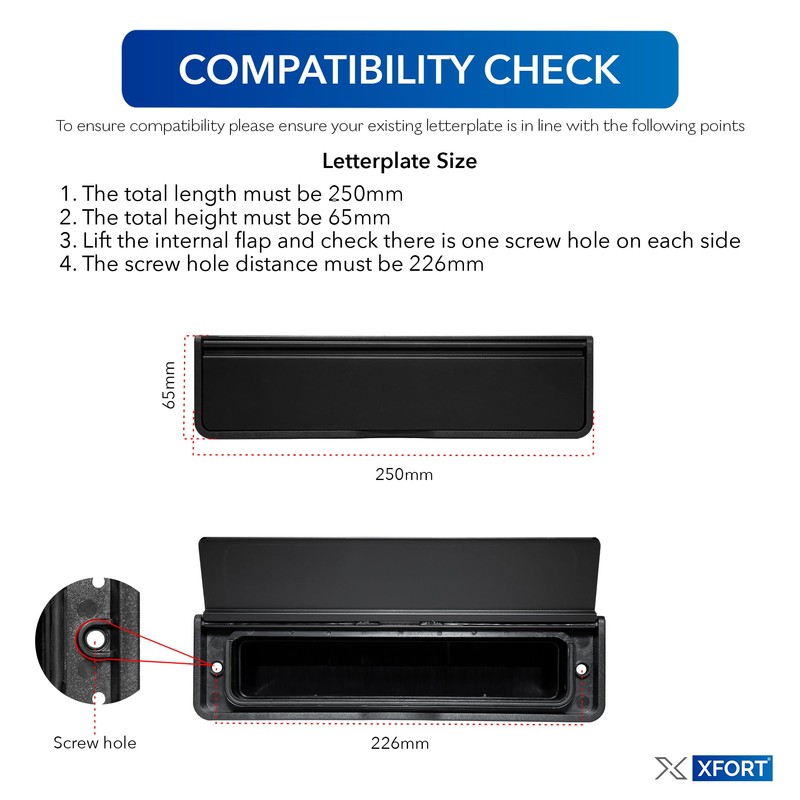 - FEATURES - The Xfort MailPlate Luxe is a revolutionary front door letter box with colour matched external and internal flaps contained within a black frame.
