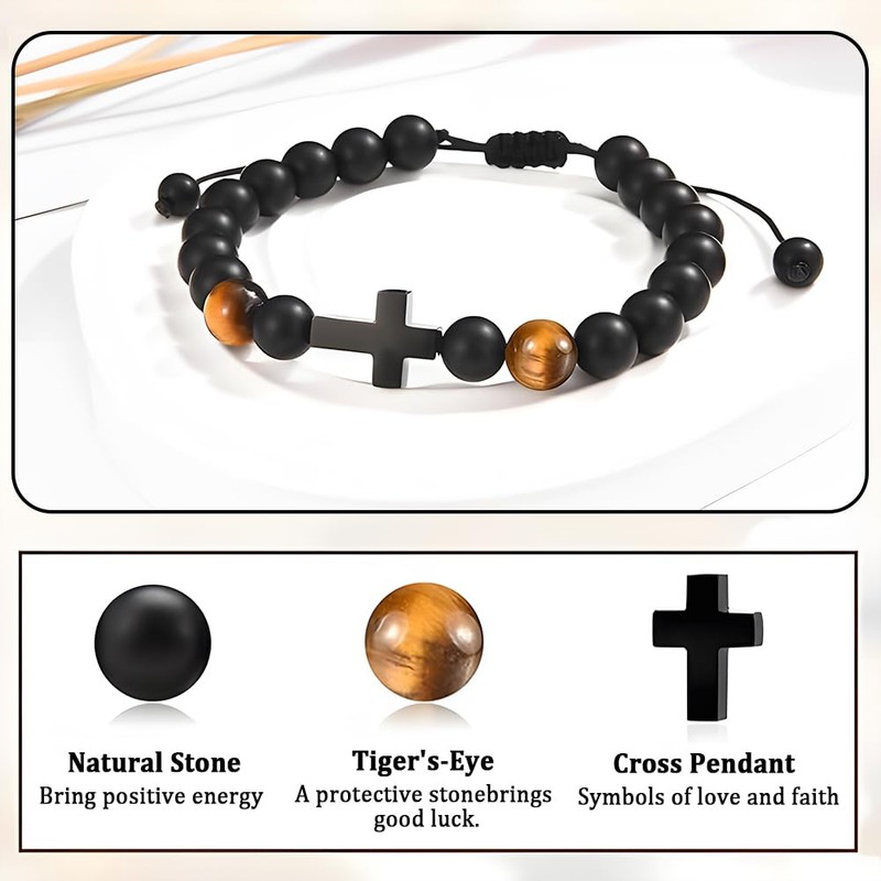 - Echte Natursteine – Das Herren Armband mit Kreuzanhänger besteht aus blauen Tigeraugensteinen und mattem schwarzen Achat – stilvoll und spirituell zugleich.