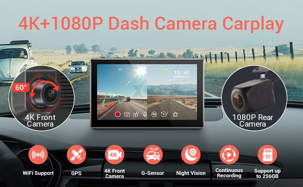 XGODY 4K Dash Cam Carplay Wireless Rearview Mirror Backup Camera Android Auto Car DVR