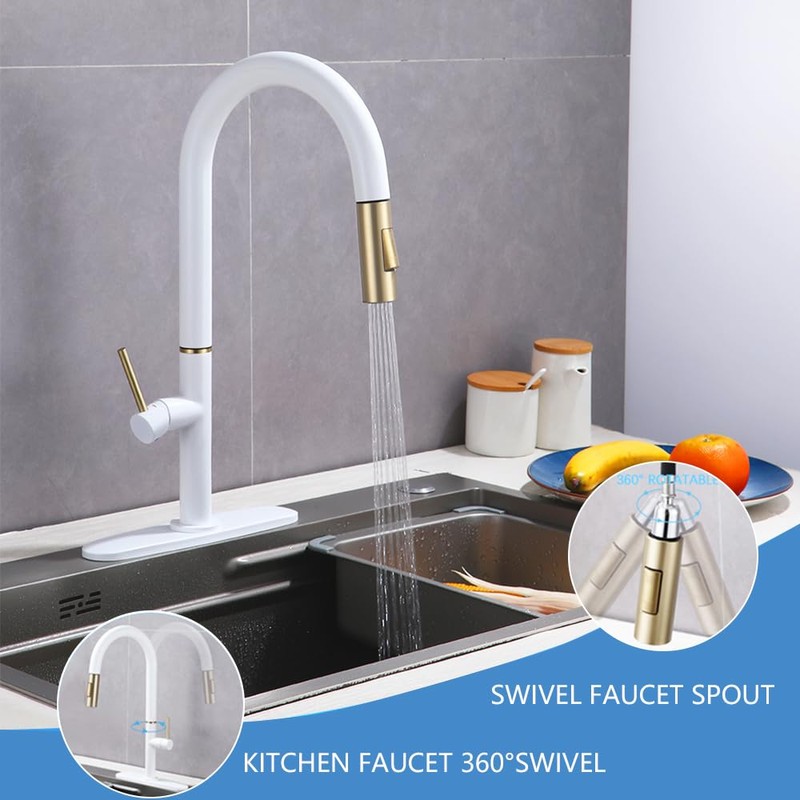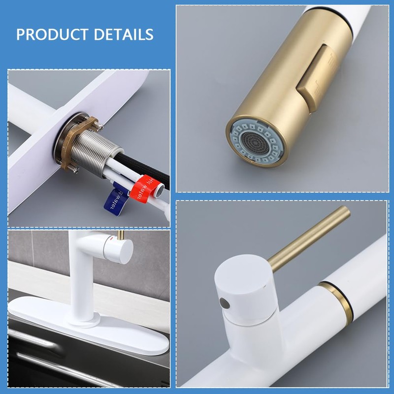 - EXCELLENT QUALITY: Your white kitchen faucet features a modern open spout design, built to withstand the rigorous demands of a busy kitchen and ensure long-lasting durability.Our pull out kitchen faucet is made with a high-quality,sturdy brass body and handle,rust-resistant coating,and premium ceramic valve core,tested to endure over 500,000 open and close cycles.