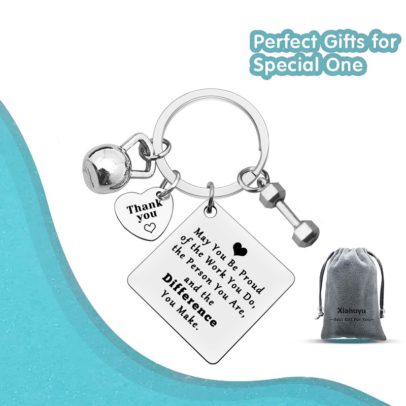 DescriptionMay you be proud of the work you do,the person you are, and the difference you makeLovely way to express gratitude and appreciation to a special Fitness Instructor, Fitness Trainer, Personal Trainer, Fitness Coach.These are meaningful gifts for yourself or a friend.Thank You Gifts for Fitness TrainerGifts Ideas for your friend or family member who works as a personal trainer, fitness coaches,fitness instructor,fitness trainers as gym workout gifts, Christmas Day gifts, Birthday Gifts, Fathers Day Gifts, Graduation Gifts, Valentines Gifts,Thanksgiving Day Gifts,New Year Gifts or just because.MaterialStainless steel; No Rust; No Allergy; No Fading; No Deformation.Package Included1 x Thank You Keychain1 x Free Nice Velvet BagOur Friendly Customer ServiceIf you have any problems with our items or services, please feel free to contact us first. We will do our best to solve any problem,and provide you with the best customer services.