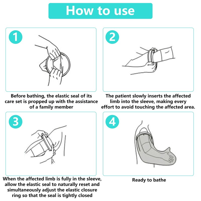 5. Geeignet zum Schutz von Gipsverbänden, Bandagen usw. Besonders geeignet für Armoperationen oder die tägliche Pflege.