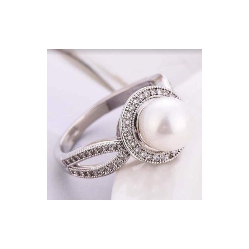 Xiaomei Women Pearl & White Sapphire 925 Sterling Silver Ring White Gold Filled White Pearl Wedding Engagement Ring Size 6-10 (Size 8)