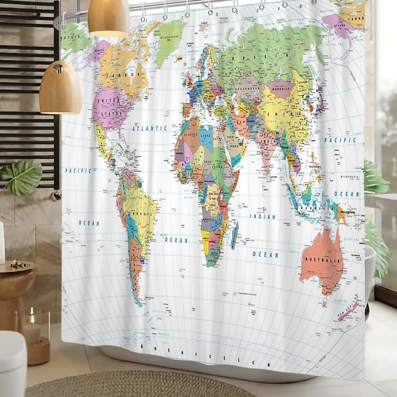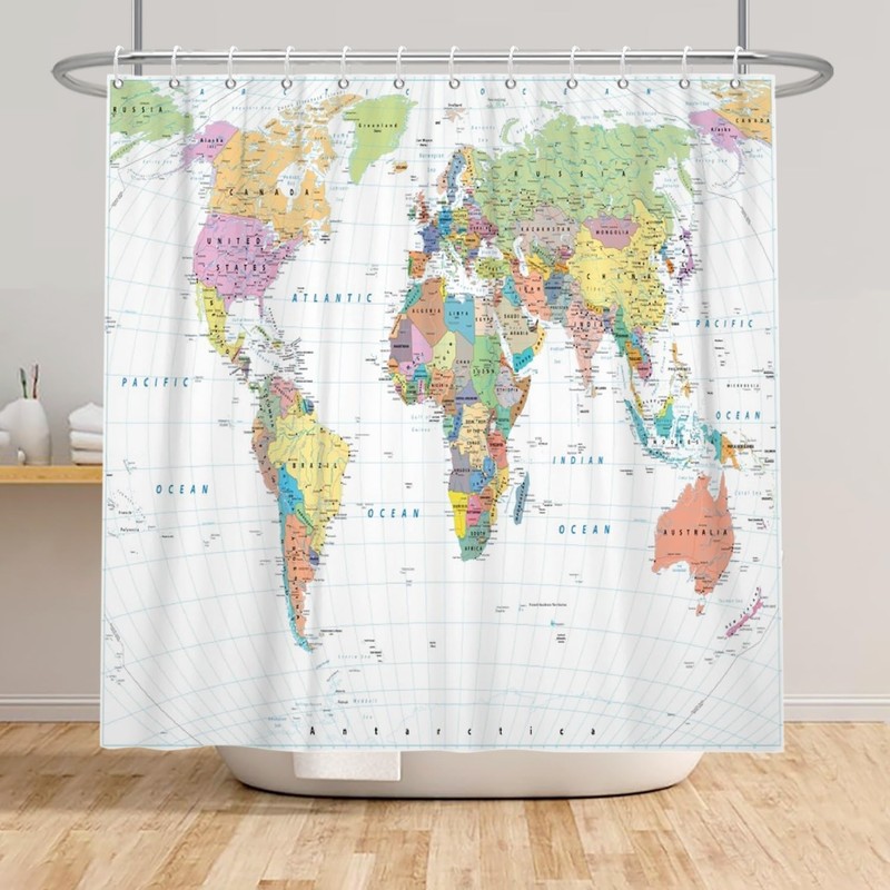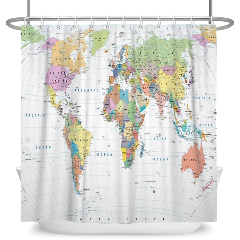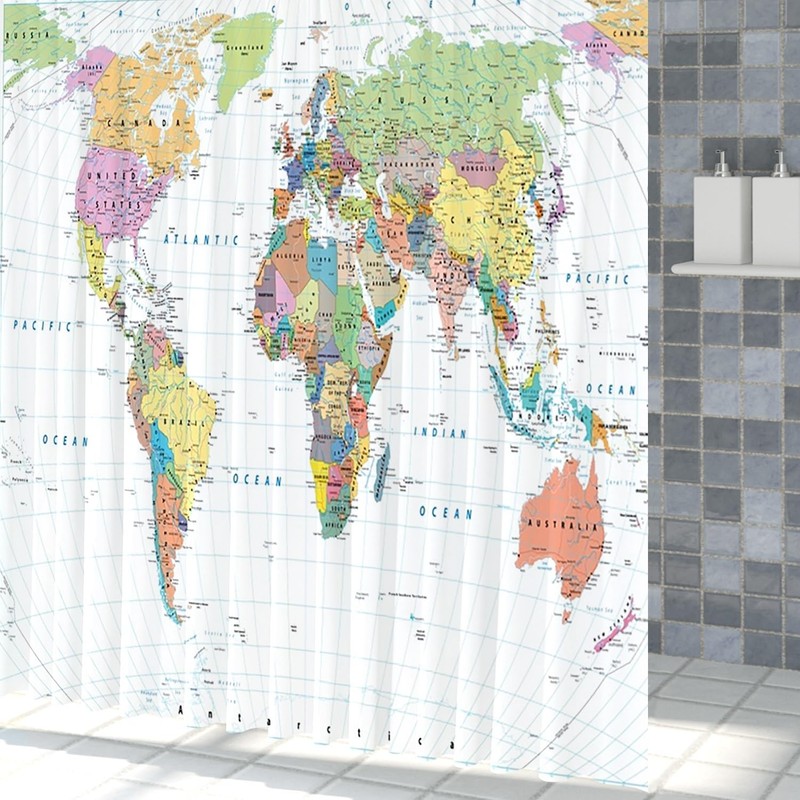 Xiaoterna World Map Shower Curtain Colourful Nautical Map Ocean Bathroom Curtain White Coastal Ocean Shower Curtain for Bathroom Machine Washable Waterproof Fabric 180 x 220 cm