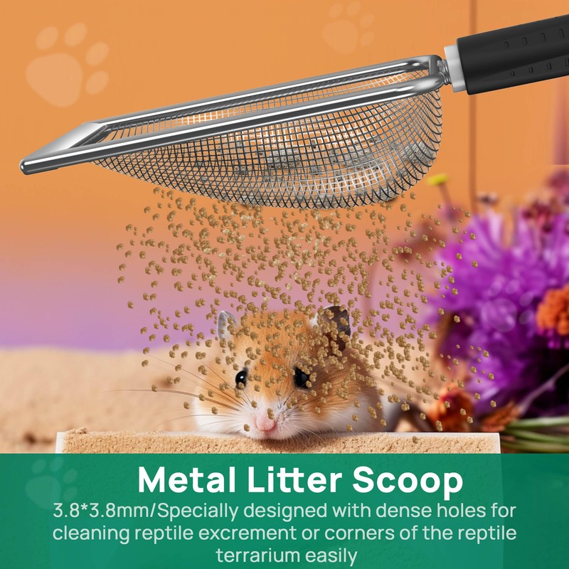 - SMALL MESH DESIGN: Our litter scooper with holder has small mesh holes designed specifically to clean the sandy substrate and sift out reptile feces without throwing away fine bedding, making cleaning quicker and easier. Clean environment makes your pet crawl healthier and happier