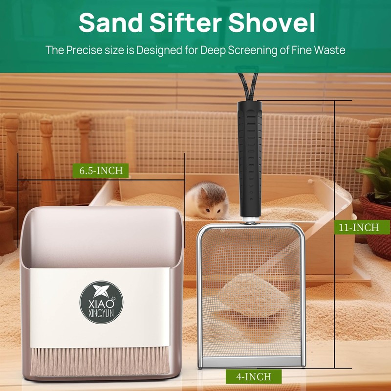 - HIDDEN STORAGE COMBO: The reptile sand scoop kit includes not only a metal litter scoop, but also a portable litter broom, dustpan and sticky hook. It not only helps you clean up the litter faster while cleaning, but also makes it easy to organize the litter scoop and broom after cleaning to keep it neat and tidy