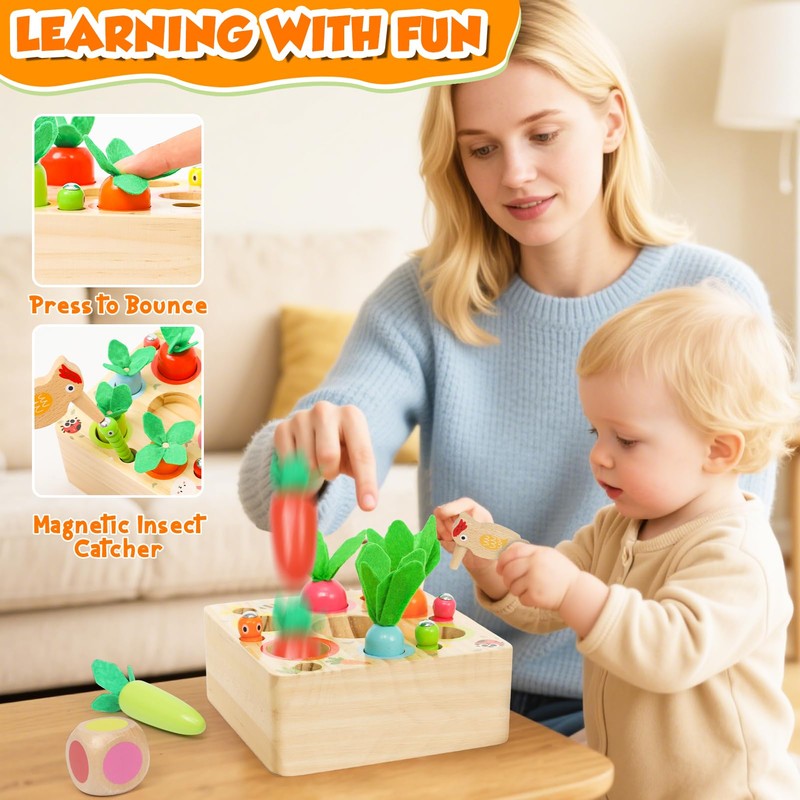 - Wide range of games: with a wooden bird for magnetic fishing, colourful carrots for sorting and a cube for fun games, this set offers varied fun and learning opportunities.