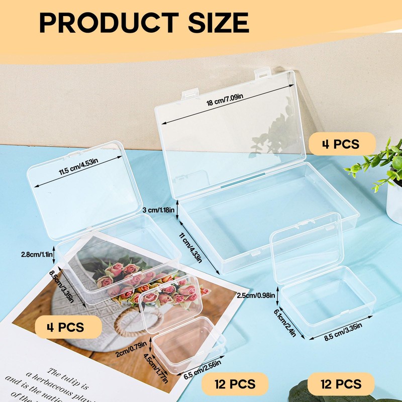 - Mixed sizes: there are 4 different sizes in our storage box with small lid, 12 pieces 6.5 x 4.5 x 2 cm, 12 pieces 8.5 x 6.1 x 2.5 cm, 4 pieces 11.5 x 8.5 x 2.8 cm and 4 pieces 18 x 11 x 3 cm, the different sizes of the storage box are able to store different items and help you classify