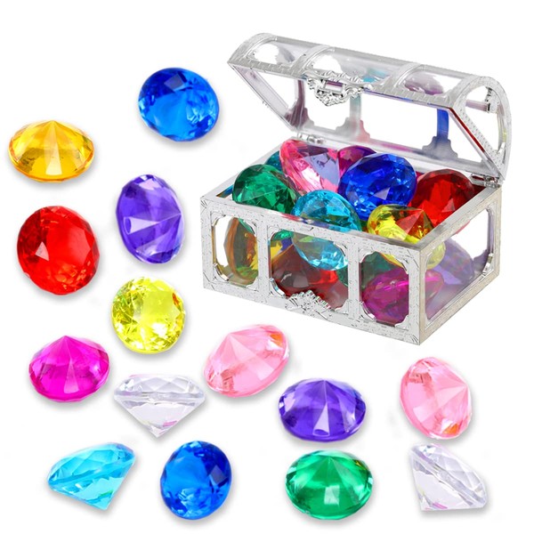 - [Packing-14 Colored Diamonds]: The diving treasure box contains gems of various colors, with blue, green, red, yellow, pink and other colors mixed, they are all packed in a pirate treasure box that may sink,beautiful The colors will attract children’s eyes and encourage them to swim. Your child can easily find it underwater.