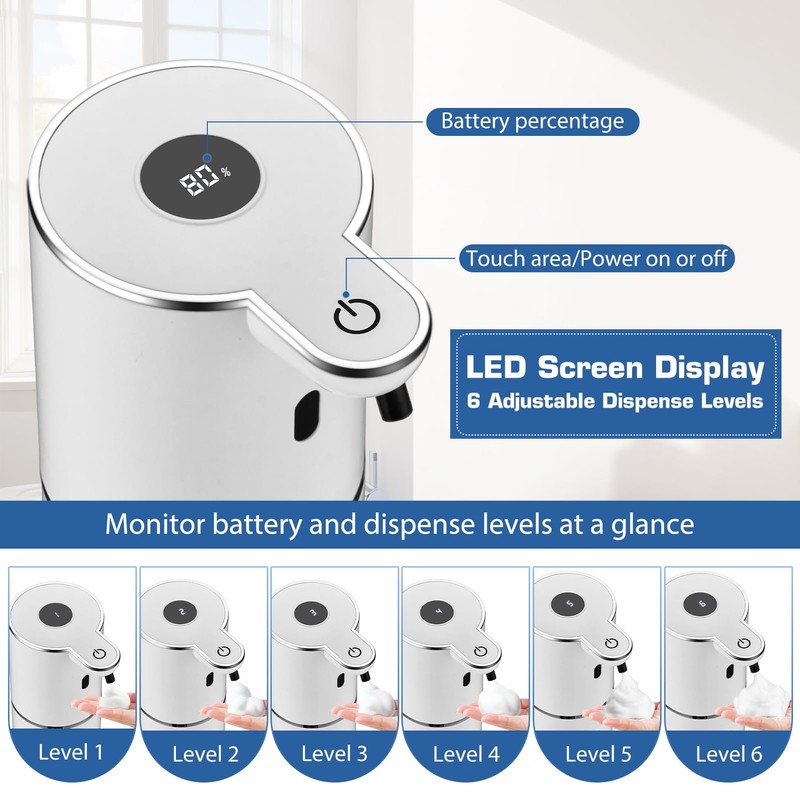 - 6 Adjustable Dispensing Modes - Our automatic soap dispenser offers 6 levels of foam adjustment to perfectly match your needs - from light hand sanitizer to rich hand lotion applications. Save up to 35% on liquid consumption. The one-touch adjustment makes switching modes effortless.