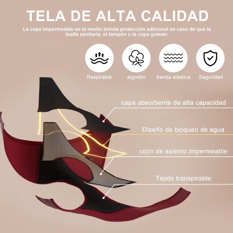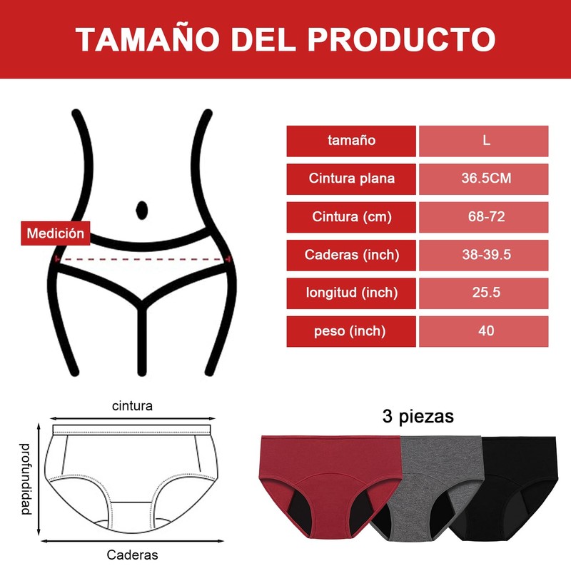 - Pantaletas menstruales mujer, tiene un revestimiento de tres capas que incluye una capa impermeable, una capa a,bsorbente y una capa a prueba de fugas. La ropa interior menstrual es ideal para los días de bajo flujo menstrual y proporciona una protección de apoyo cuando se utiliza con otros productos menstruales en los días más intensos.