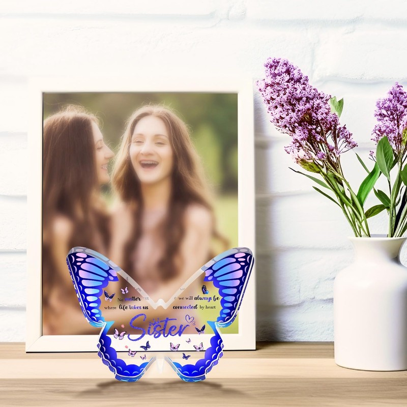 - Butterfly-shaped acrylic keepsake is a perfect gift for Sisters bestie to show them you care and love .They are printed with warm words and beautiful elements. Surprise sister bestie with this heartfelt gift.With the sentimental message"No matter where life takes us,we will always be connected by heart".Thinking about the scene when your sister receive this heart-warming gift and every time they see this memoriable gift, what a happiness moment it will be for her!