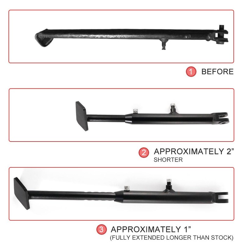 It can also be extended approximately1.5inch / 3.81cm longer than the OEM kickstand.