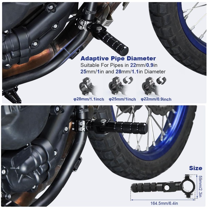 - POWERFUL FUNCTION: It is mounted on the fram bar tube or guard bar of the bike, it means that it does not need to be mounted in a fixed position and can be mounted anywhere on the tube according to your needs; and the footpegs are knurling designed in , non-slip for maximum grip